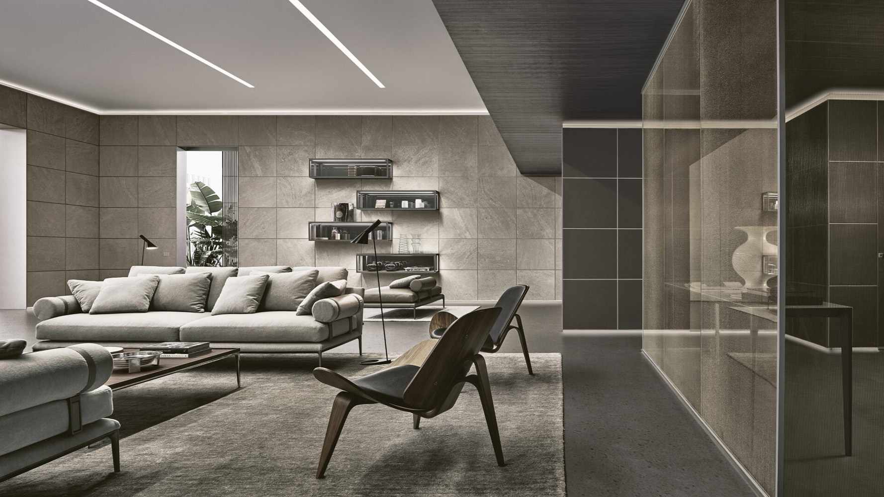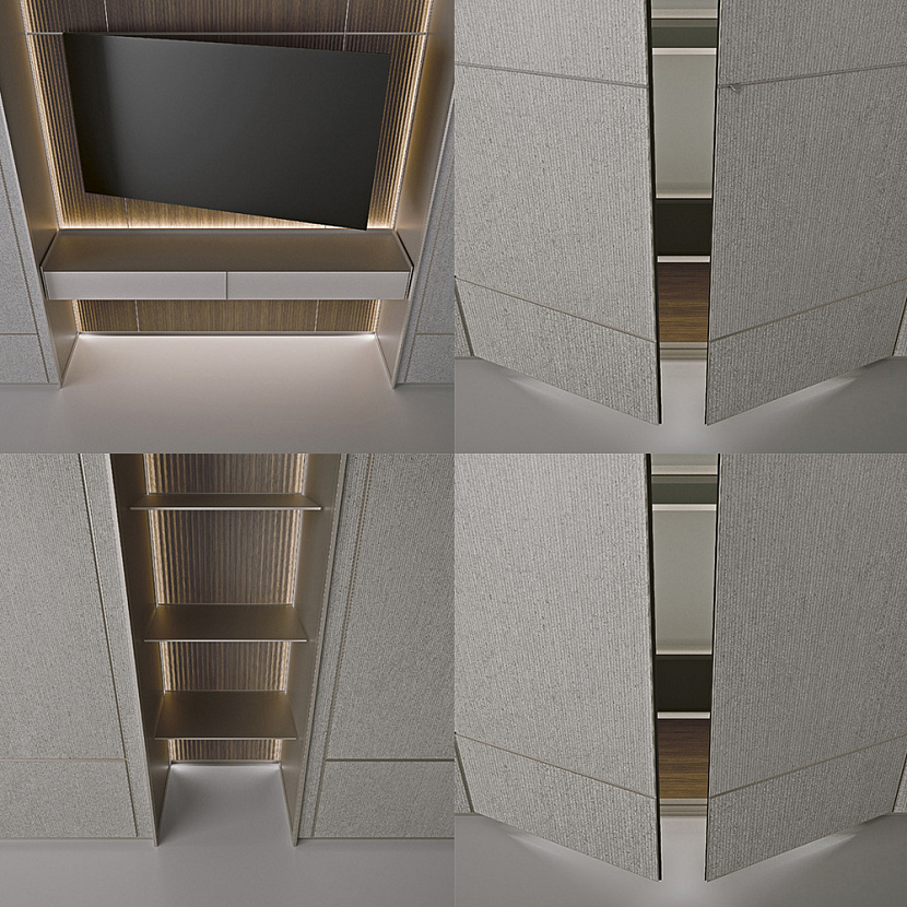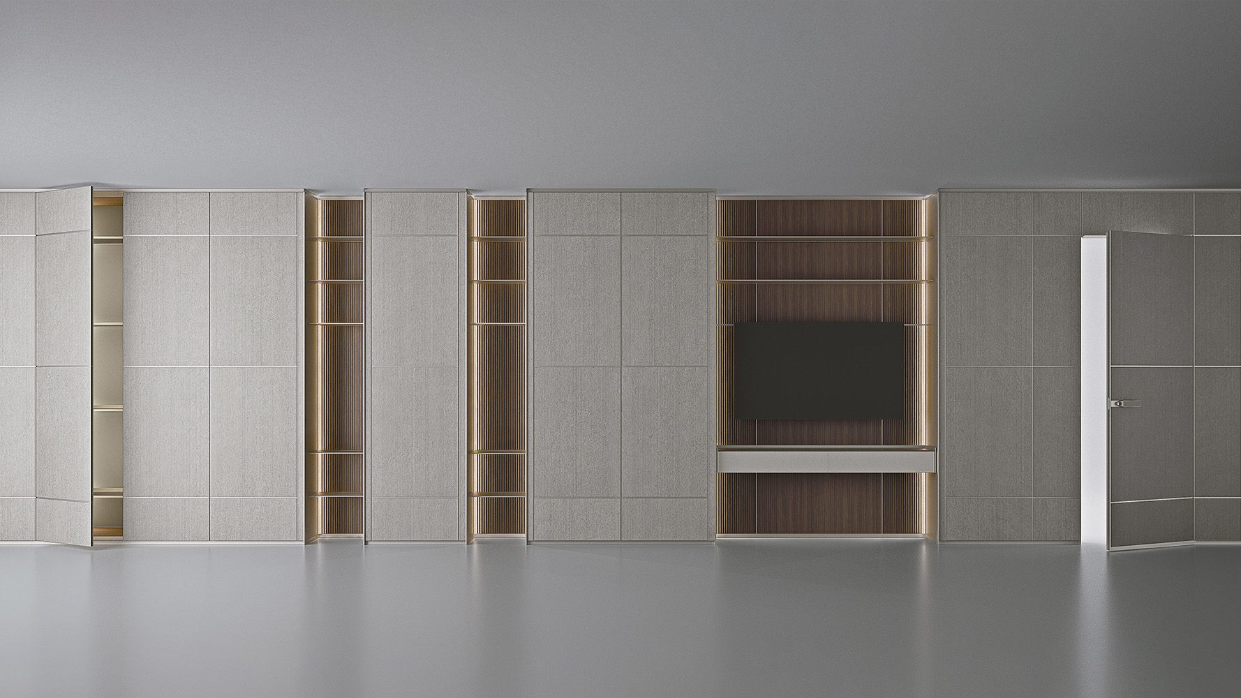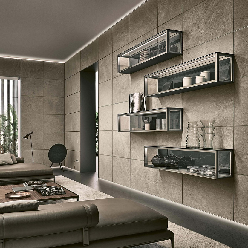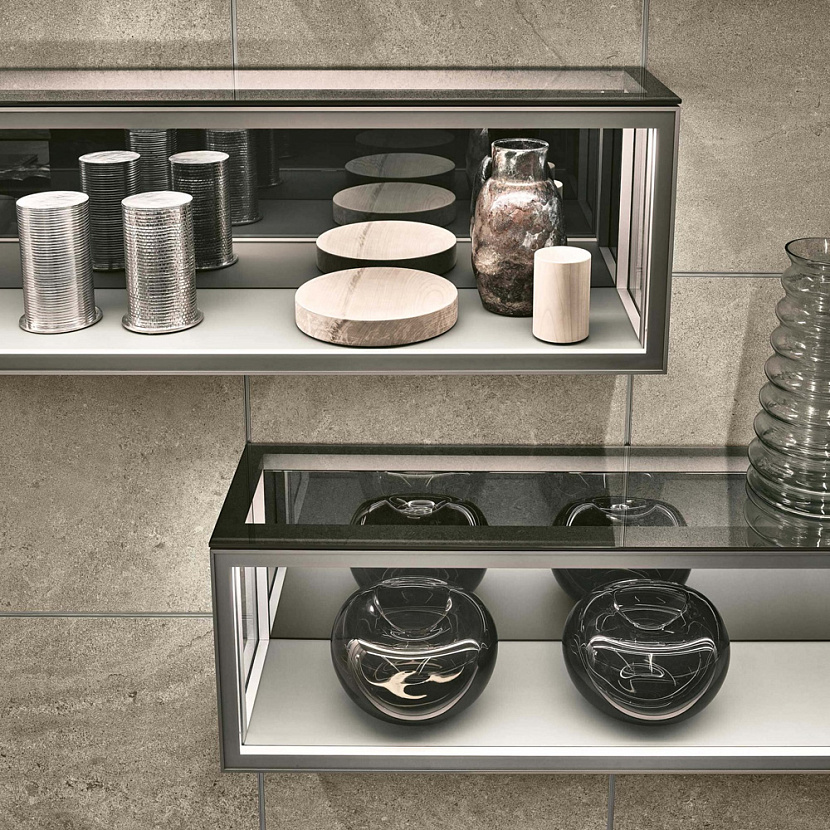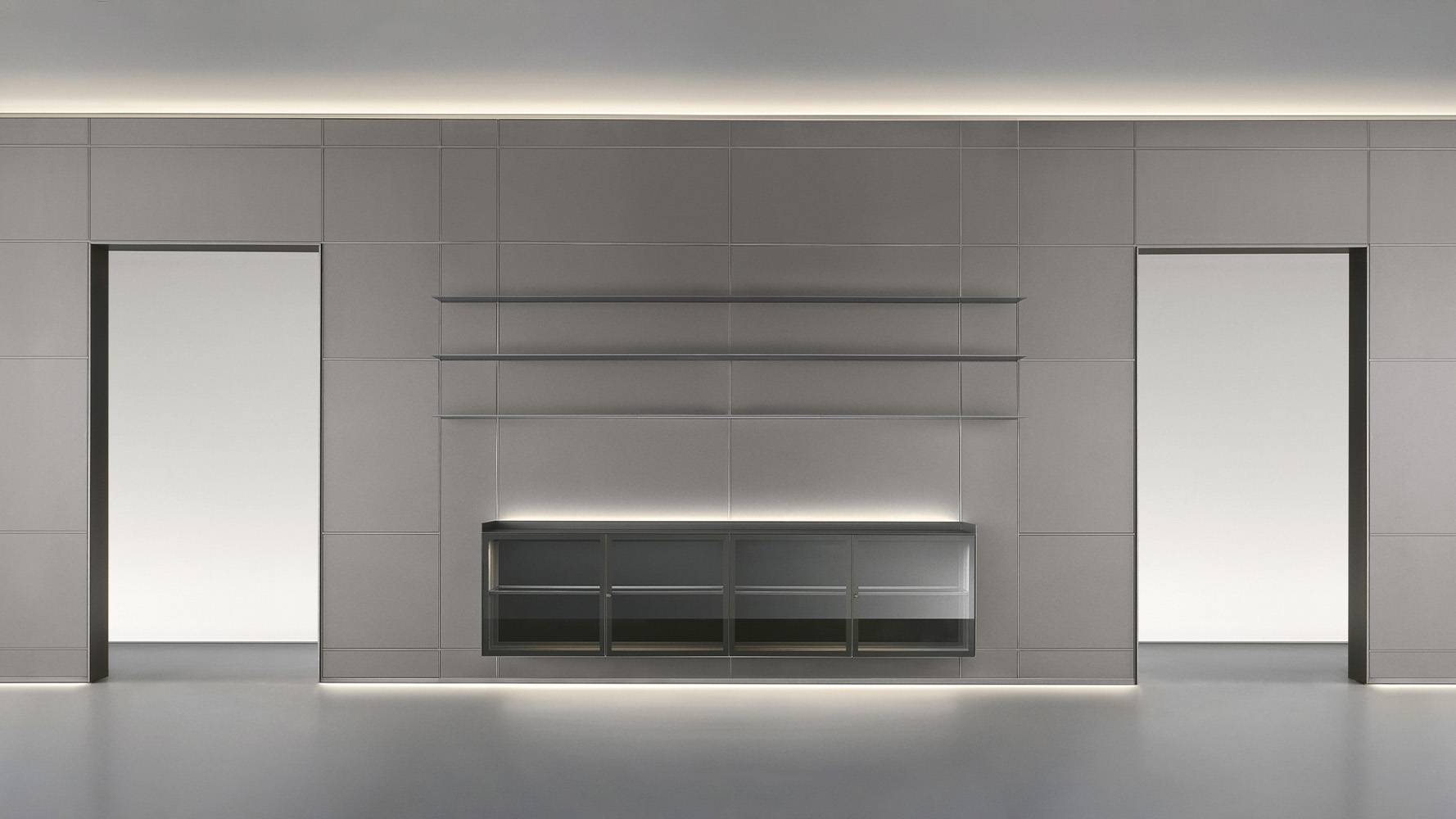 Версия Modulor для розничной торговли превращает поверхность стены в функциональную архитектурную структуру, объединяющую витрины, полки и шкафы в единую композицию. Алюминиевые структурные профили формируют чёткий вертикальный и горизонтальный ритм, на котором размещаются стеклянные витрины, ниши и элементы хранения.