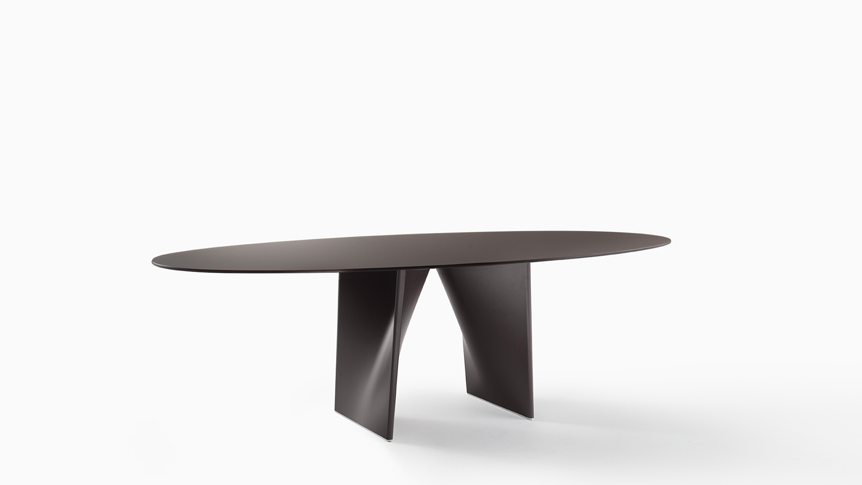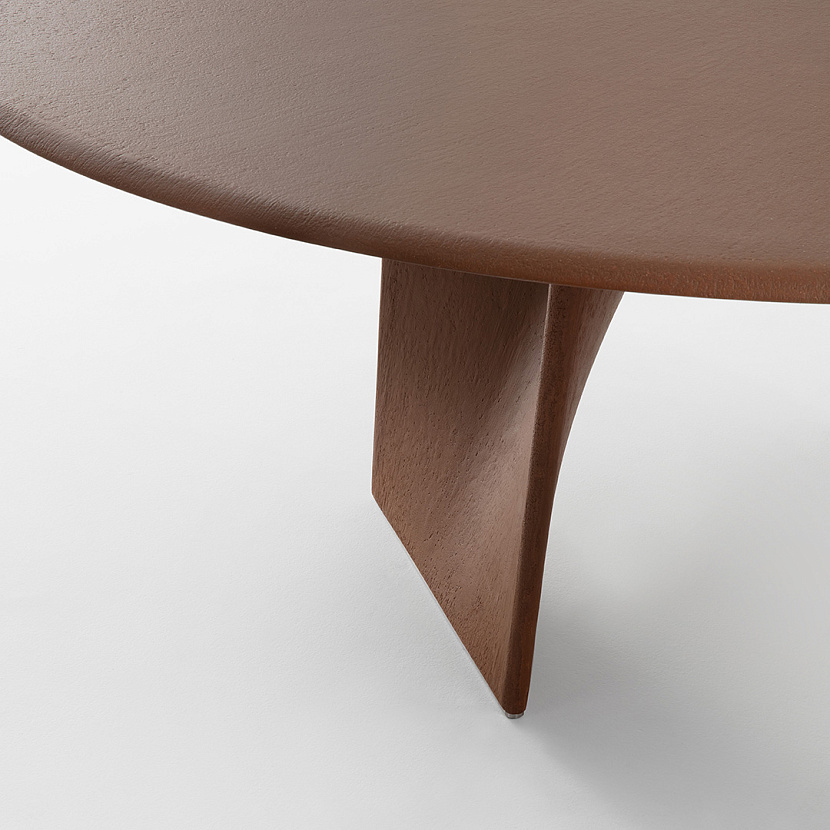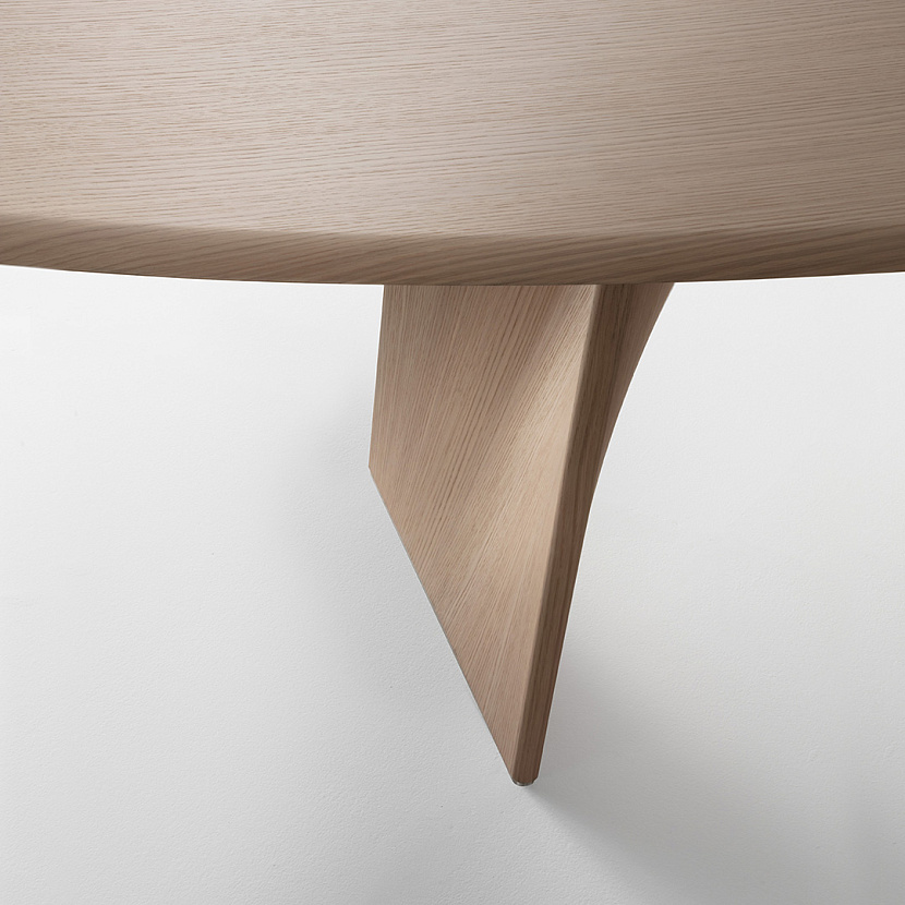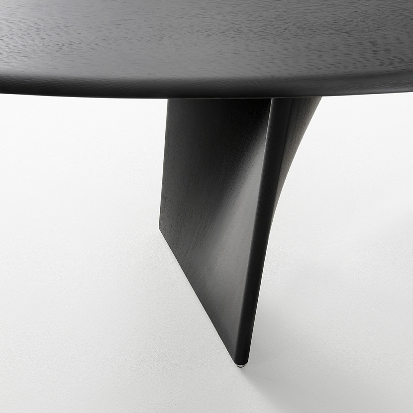 Стол с центральным основанием из лакированной многослойной конструкции с внутренним стальным балластом, сердечником из древесного волокна высокой плотности и двойными алюминиевыми пластинами. Такая конструкция обеспечивает устойчивость и баланс пропорций.