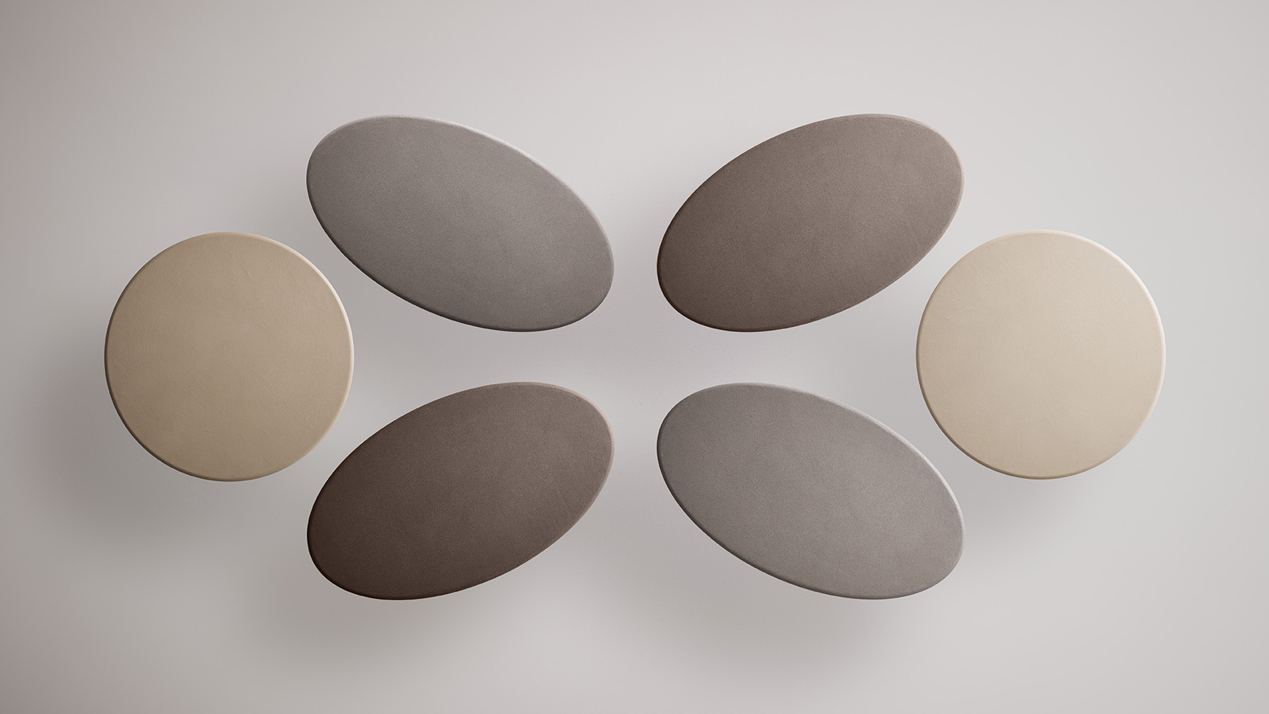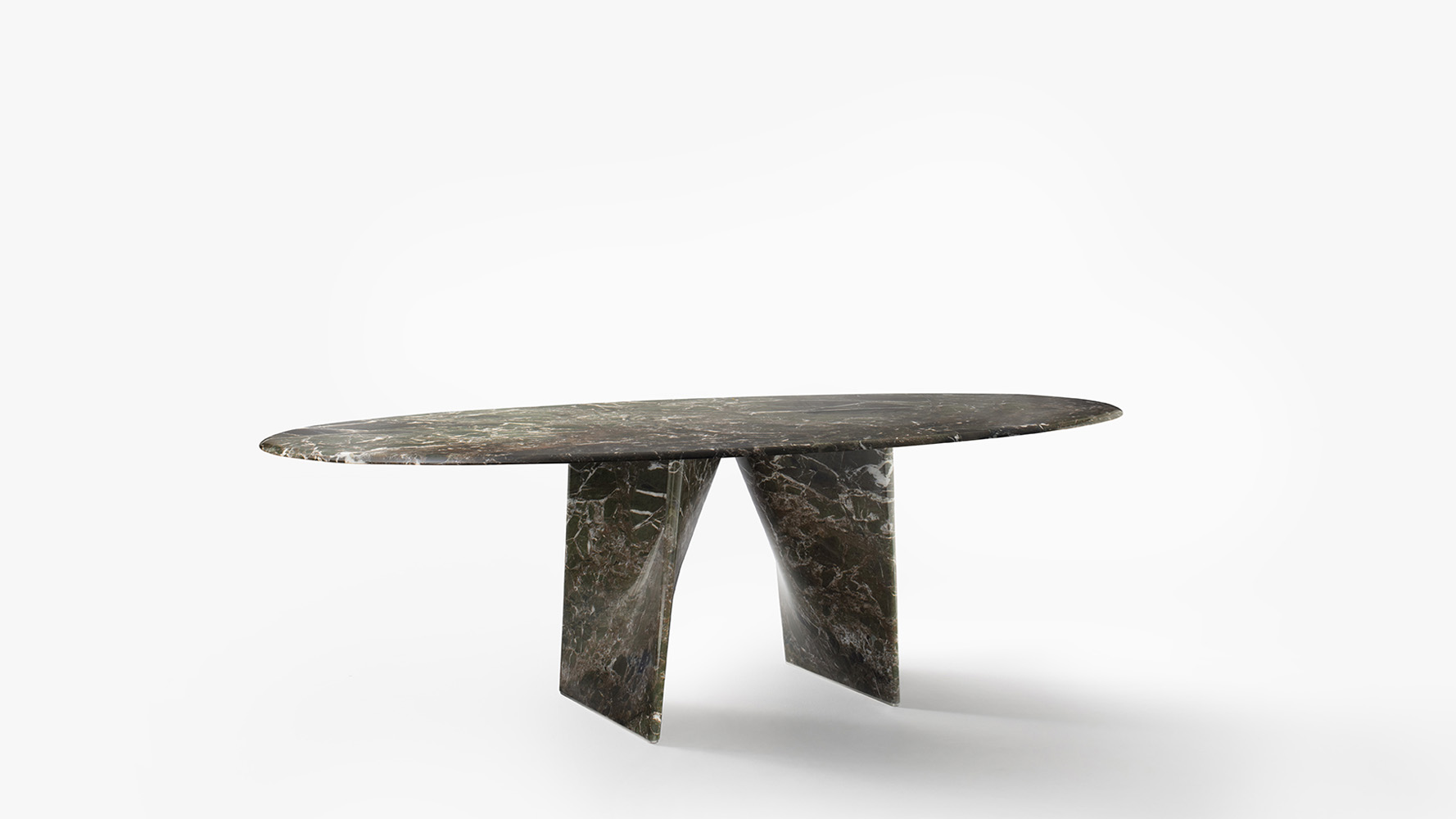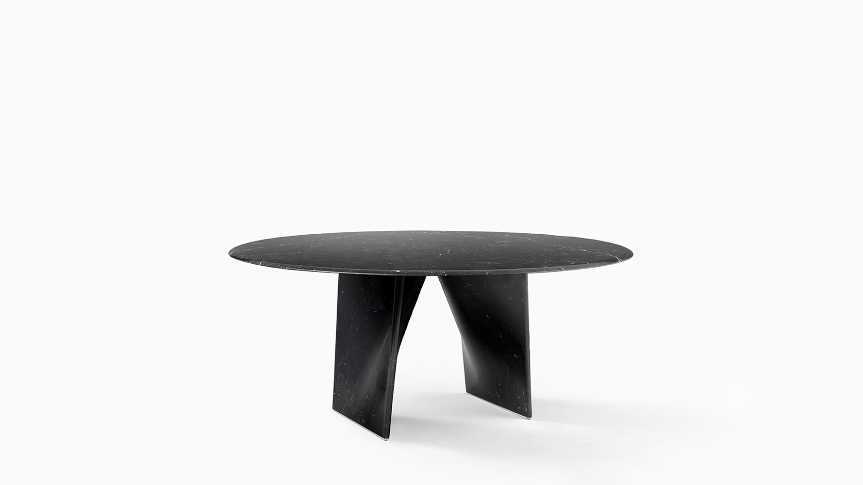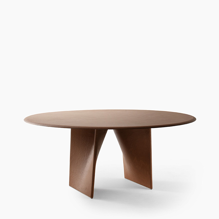 Стол представлен в круглых и овальных версиях. Столешница может выполняться из лакированного стекла, дерева, мрамора или материала Terrae. Для круглой версии доступна опция вращающегося центрального подноса, интегрированного в столешницу.