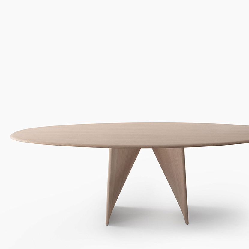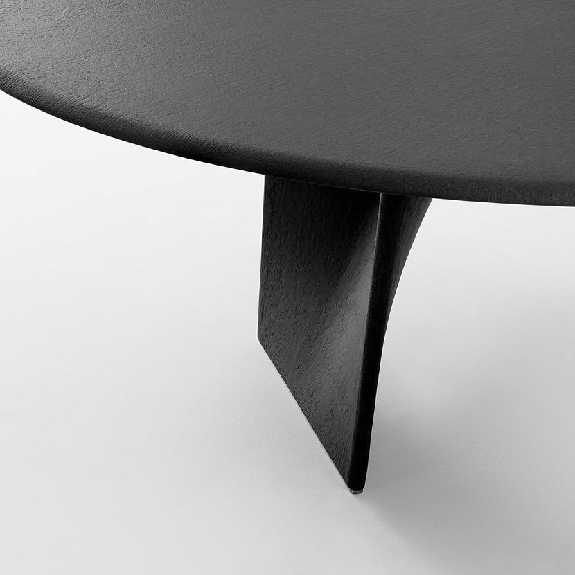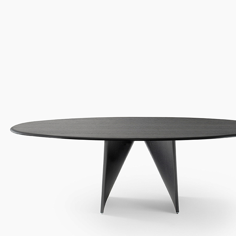 Конструкция стола построена вокруг центральной опоры, состоящей из двух элементов, сходящихся в центре и формирующих графическую форму, напоминающую греческую букву λ. Такая геометрия создаёт визуальную лёгкость конструкции при высокой структурной устойчивости.