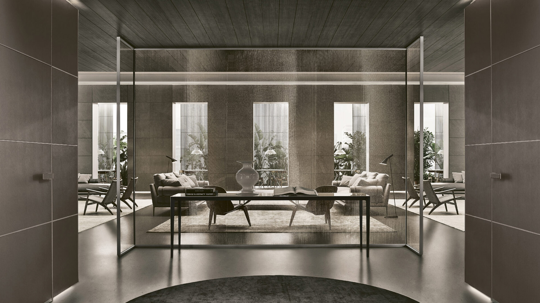 Long Island интегрируется в интерьеры гостиной зоны, где требуется минималистичная консоль с чёткой архитектурной геометрией и лёгкой конструкцией.
