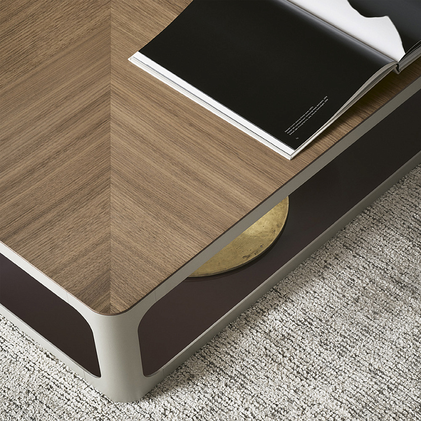 Журнальный стол с каркасом из алюминия и двумя столешницами. Верхняя и нижняя поверхности выполняются из лакированного стекла (Ecolorsystem) или дерева и объединены вертикальными алюминиевыми элементами. Модуль может повторяться по высоте.