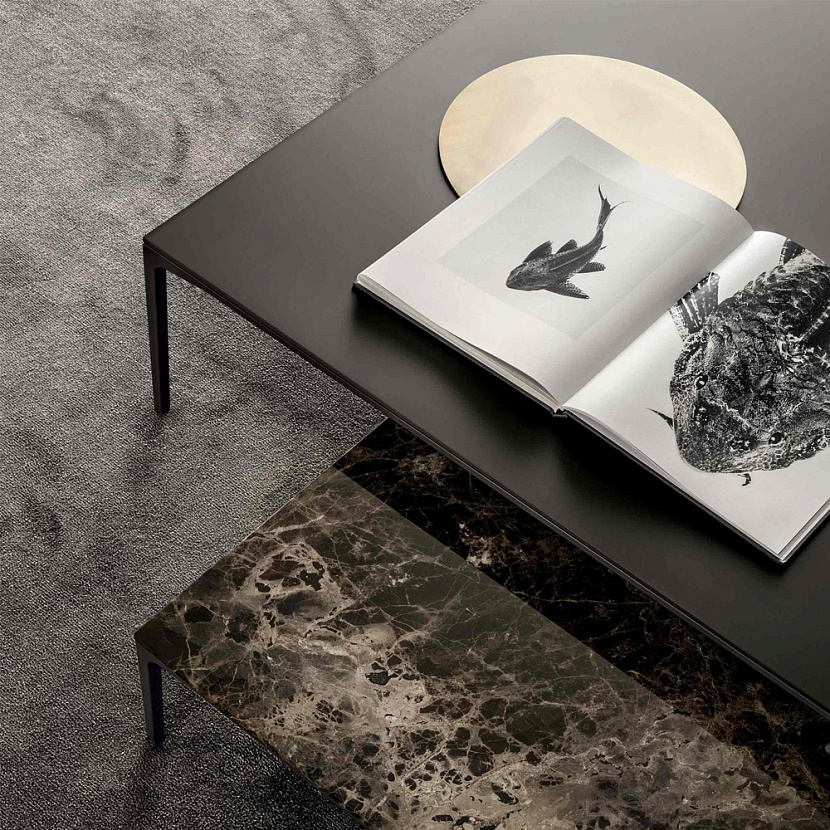 Система представляет собой коллекцию низких столов с алюминиевым каркасом и съёмной столешницей-подносом. Конструкция строится на сочетании тонкой металлической рамы и верхней поверхности из стекла, дерева или мрамора, формируя лёгкую и чёткую геометрию.