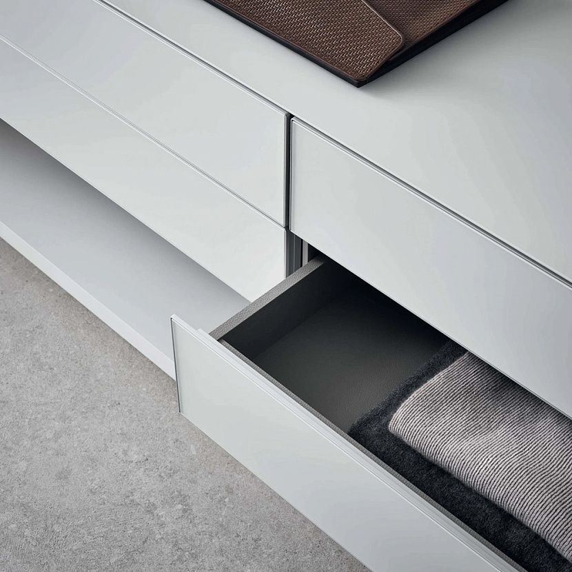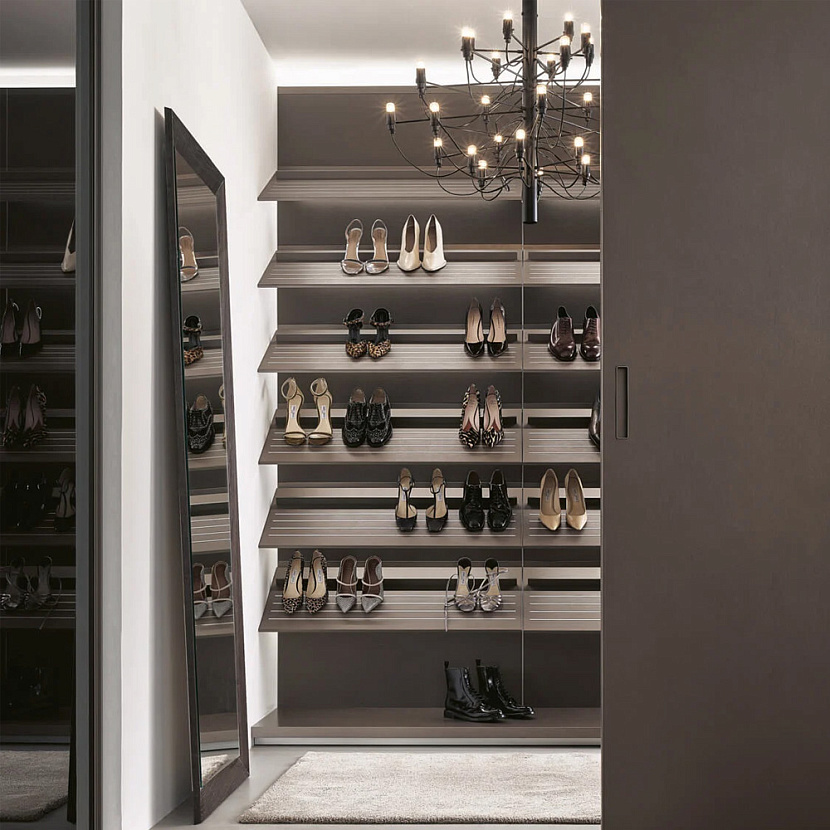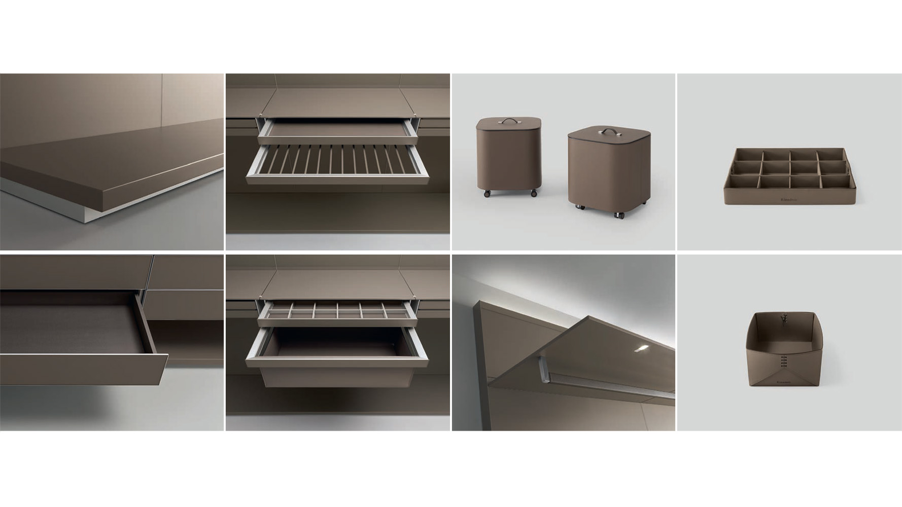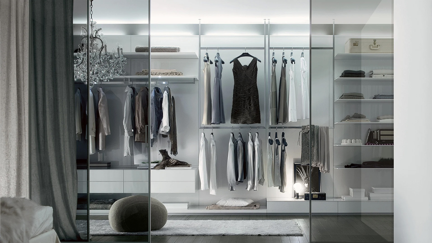 Система построена на стеновых панелях из лакированного стекла, ткани, рафии или экокожи, которые формируют цельную архитектурную поверхность гардеробной. На эти панели крепятся все элементы оборудования — полки, штанги для одежды, ящики и аксессуары хранения — благодаря чему система выглядит лёгкой и визуально чистой.