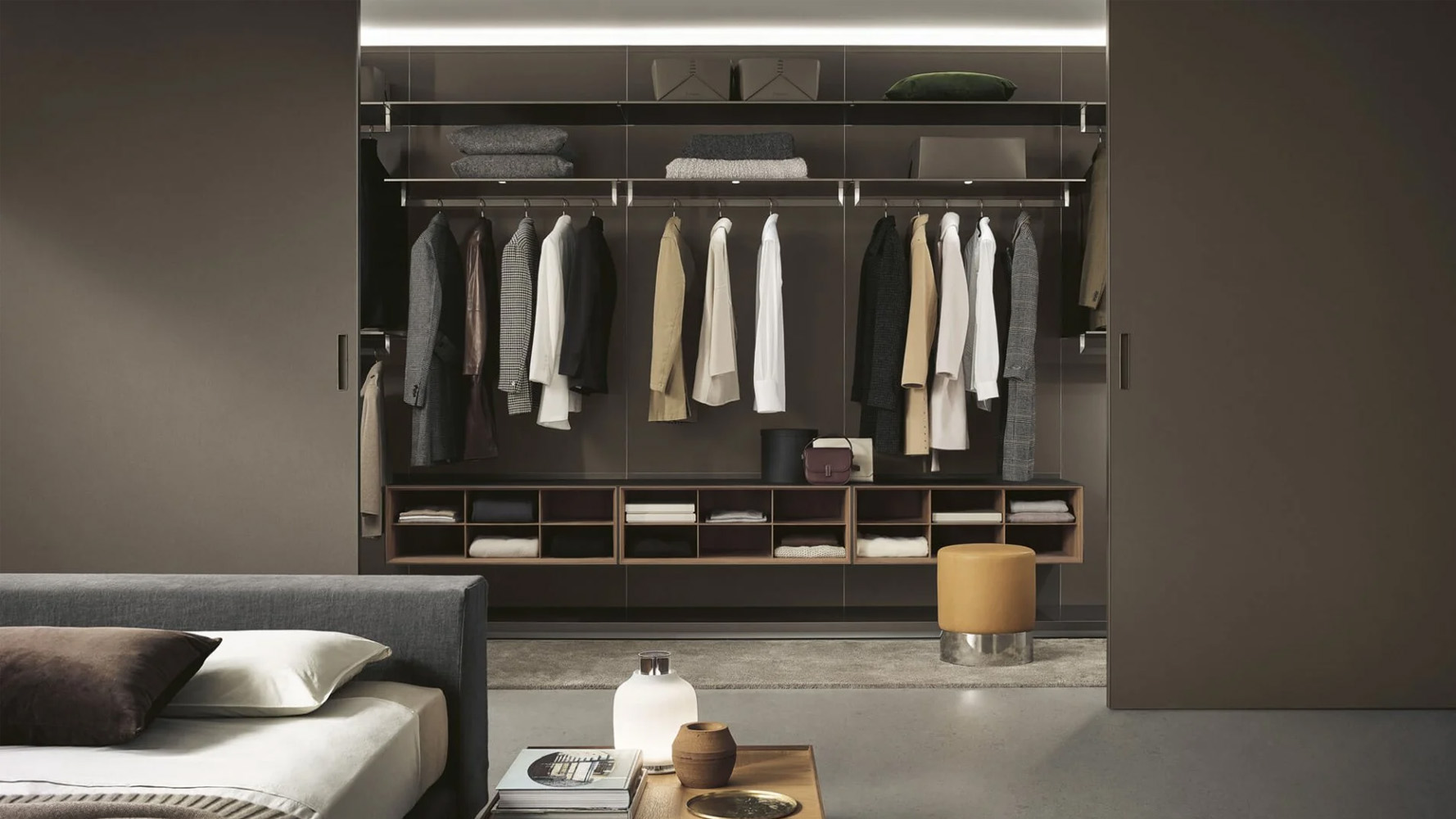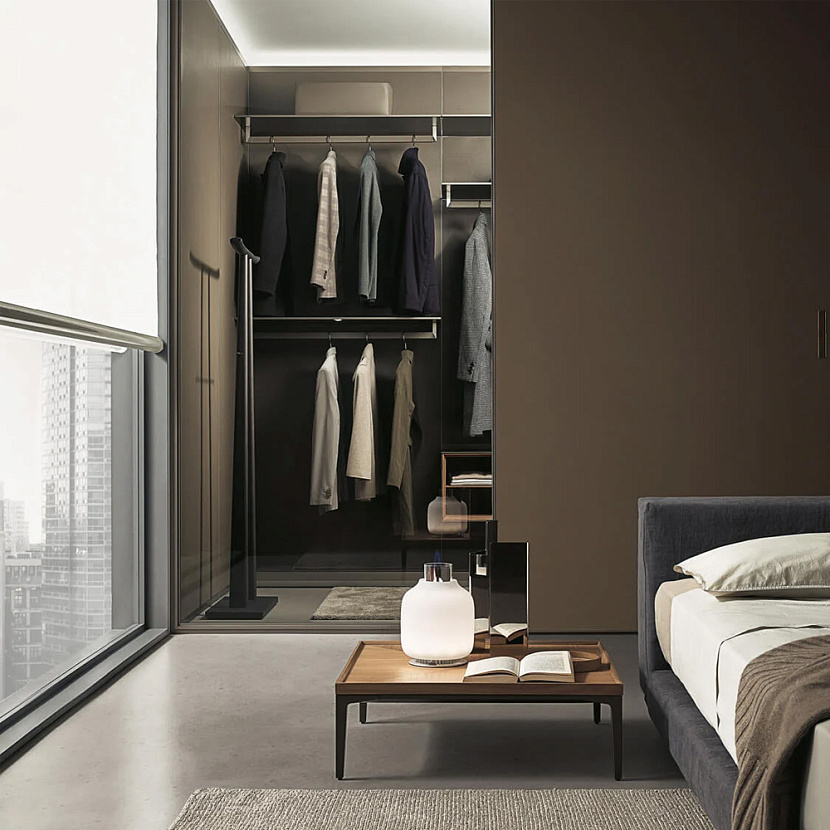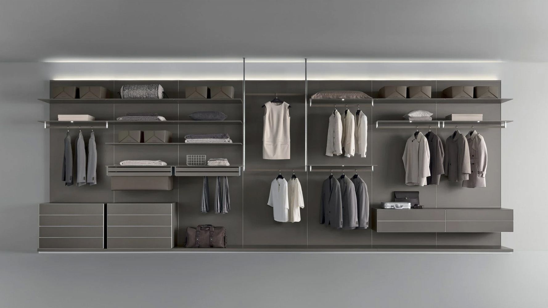 Abacus интегрируется в интерьеры гардеробных комнат и мастер-гардеробных, где требуется архитектурная система хранения одежды с цельной стеновой структурой и строгой геометрией.