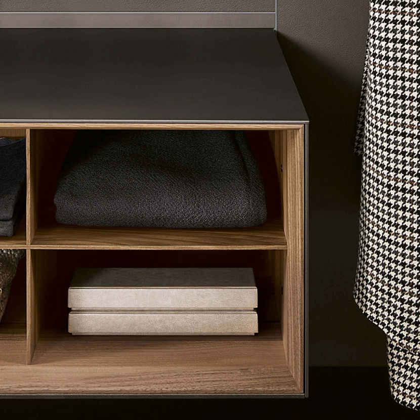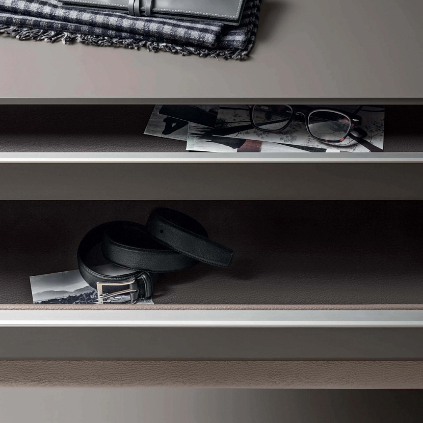Характерной особенностью Abacus являются горизонтальные элементы минимальной толщины, формирующие строгий ритм композиции. Встроенная LED-подсветка интегрируется в верхнюю часть панелей и нижнюю часть полок, создавая мягкое освещение гардеробной и подчёркивая материалы системы.