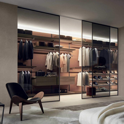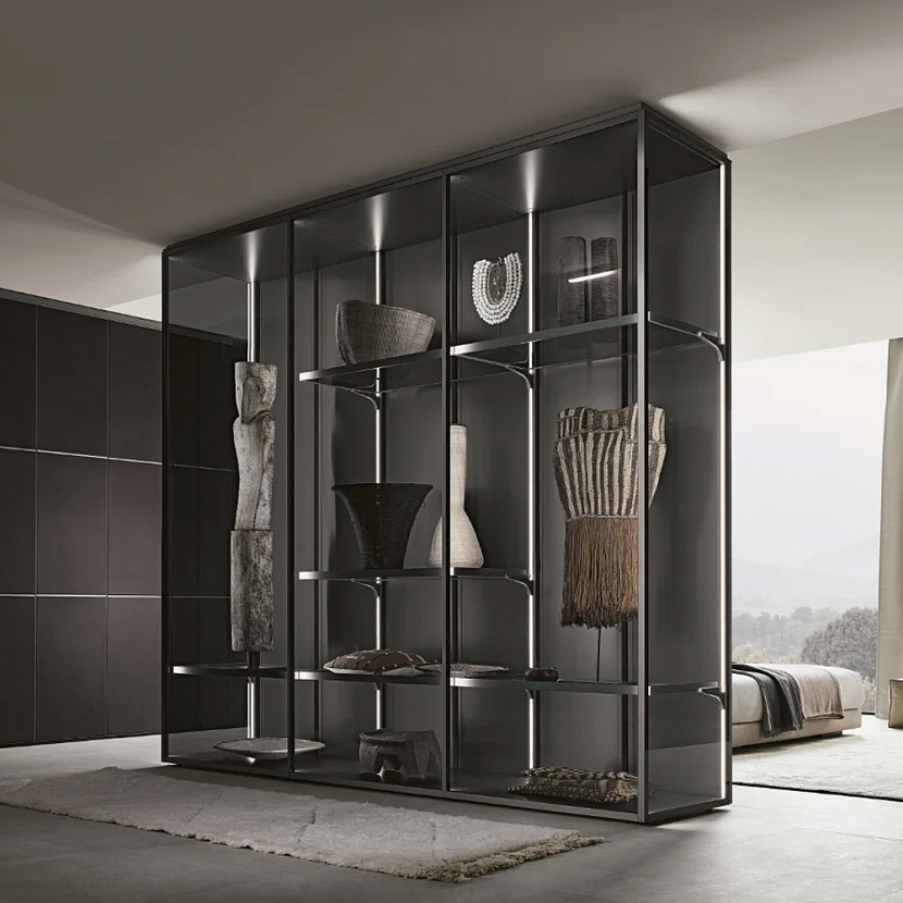 Отдельно стоящая гардеробная система с алюминиевой структурой, стеклянными дверями, боковыми и задними панелями.