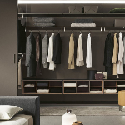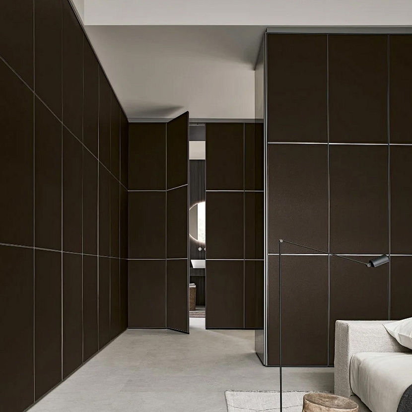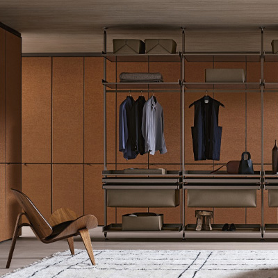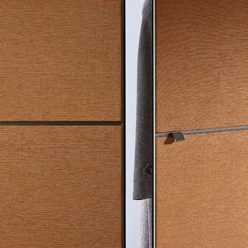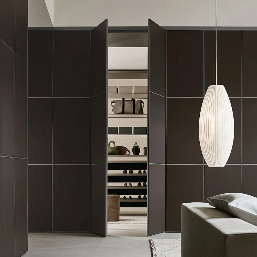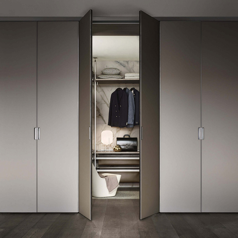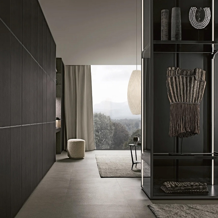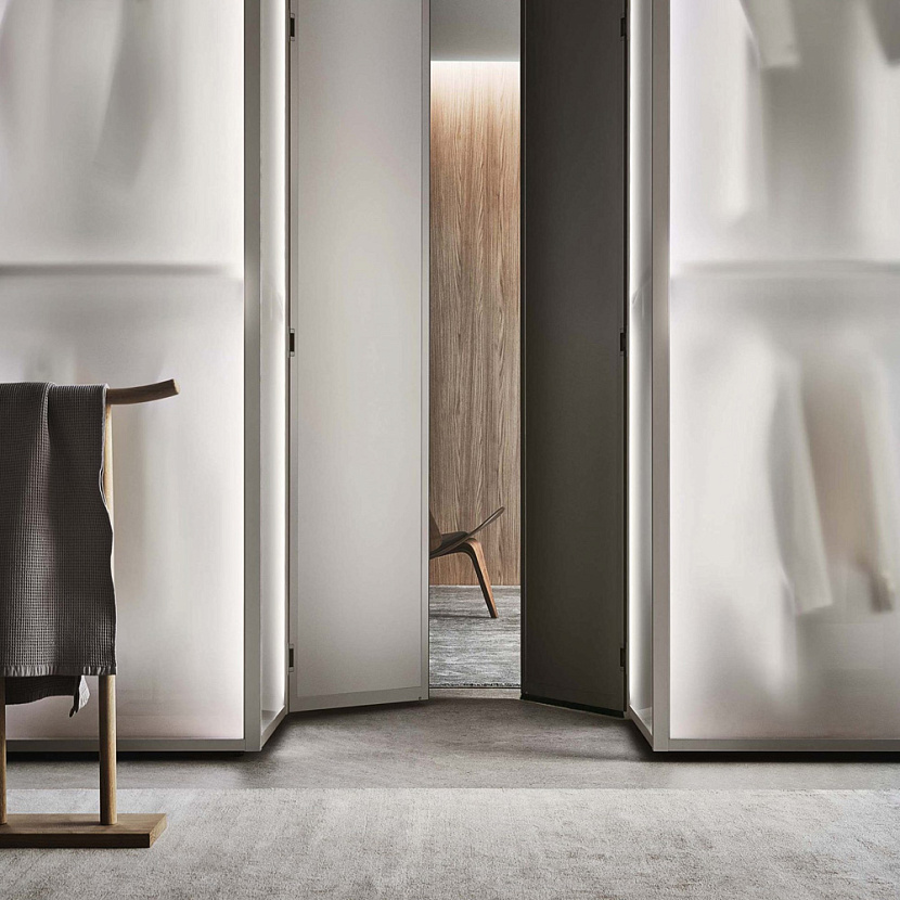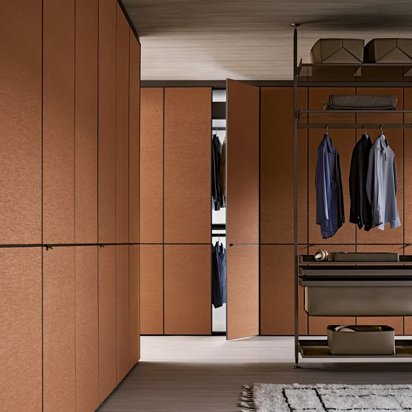 Широкий выбор материалов и отделок — стекло различных типов, Litech, ткань, рафия, экокожа и дерево — позволяет создавать как прозрачные гардеробные-витрины, так и более закрытые шкафные композиции.
