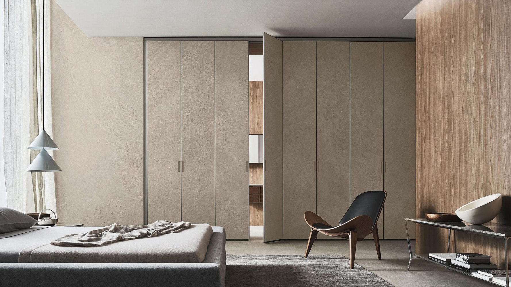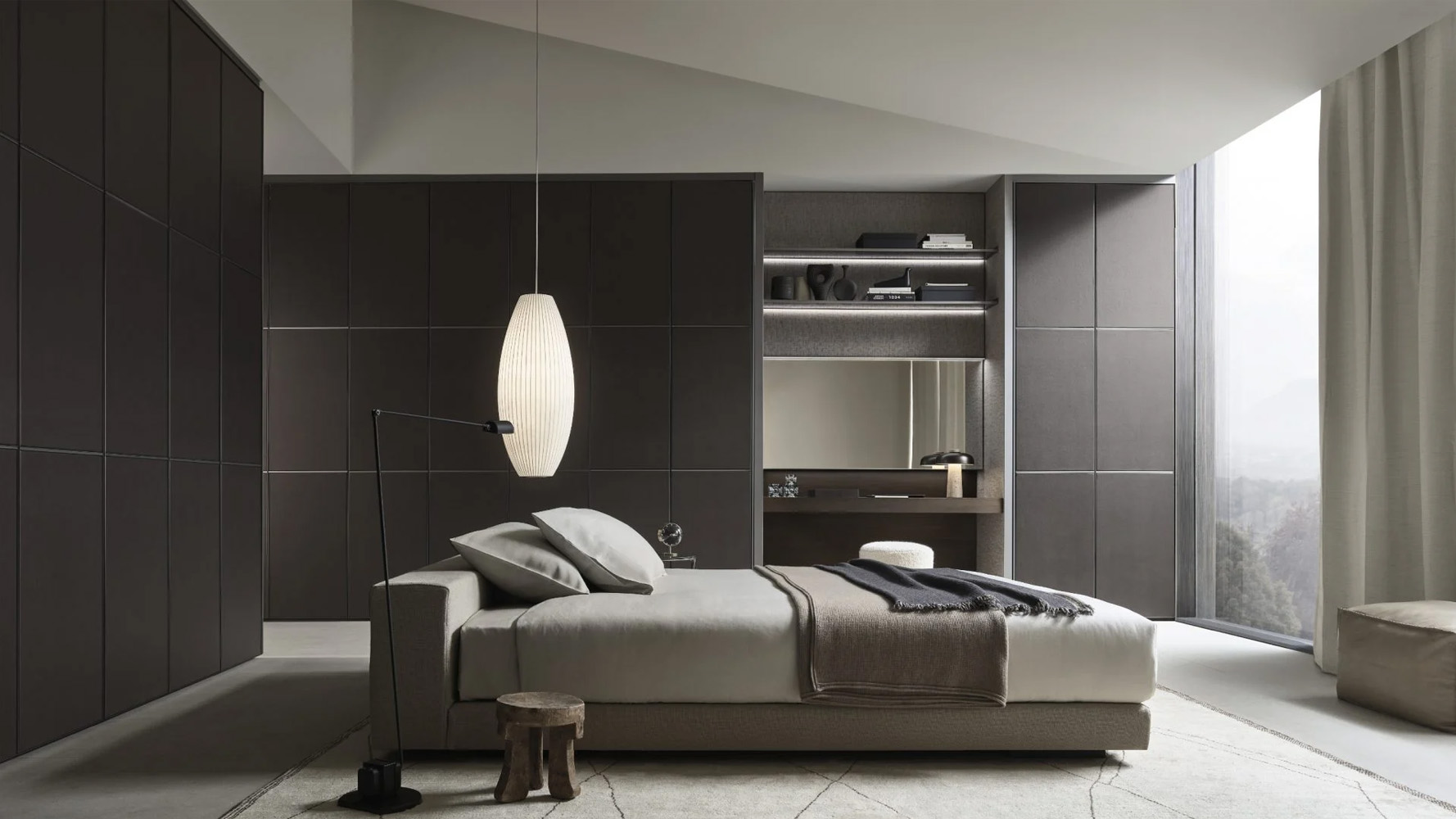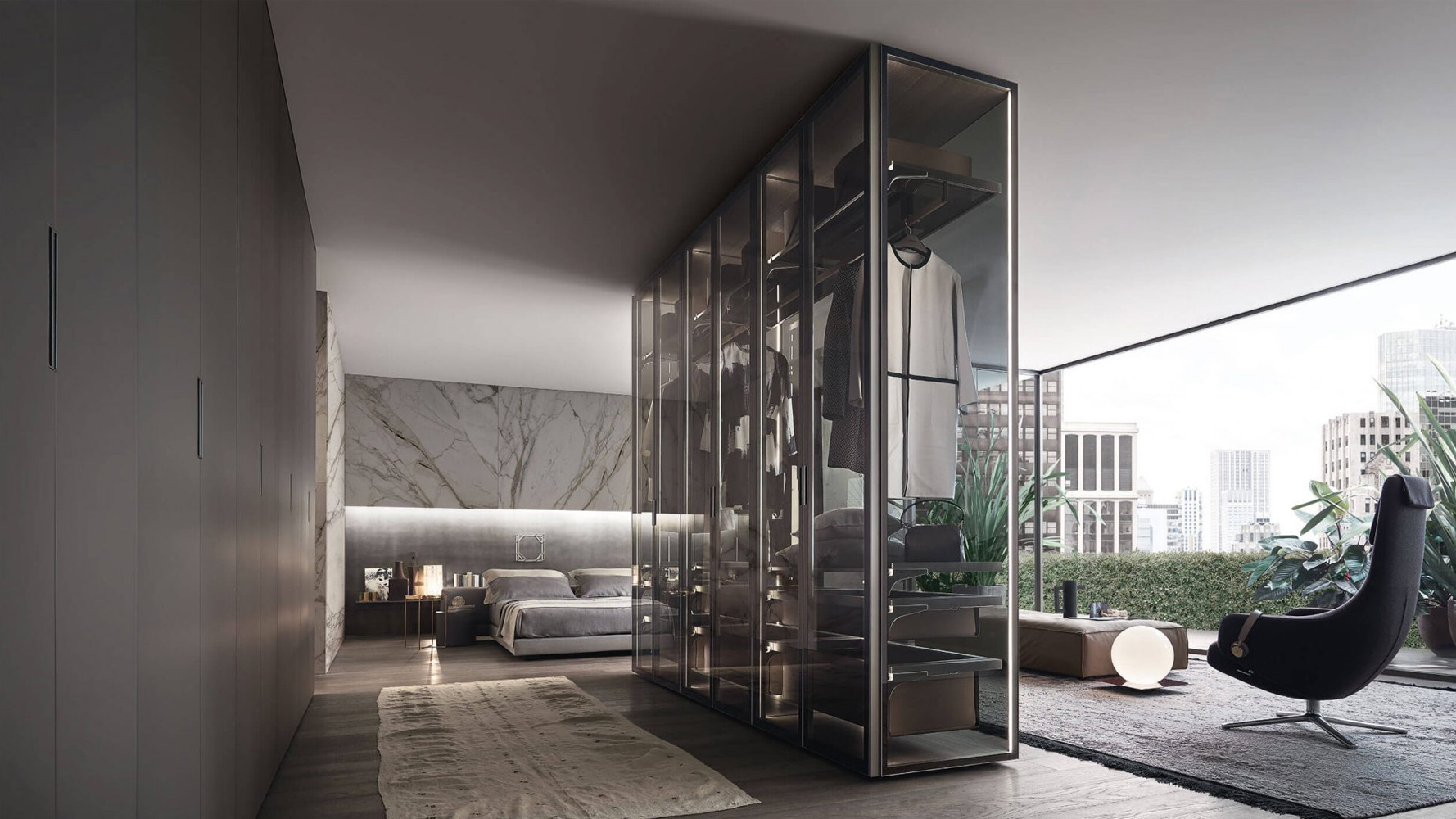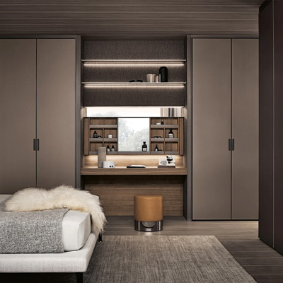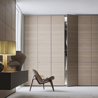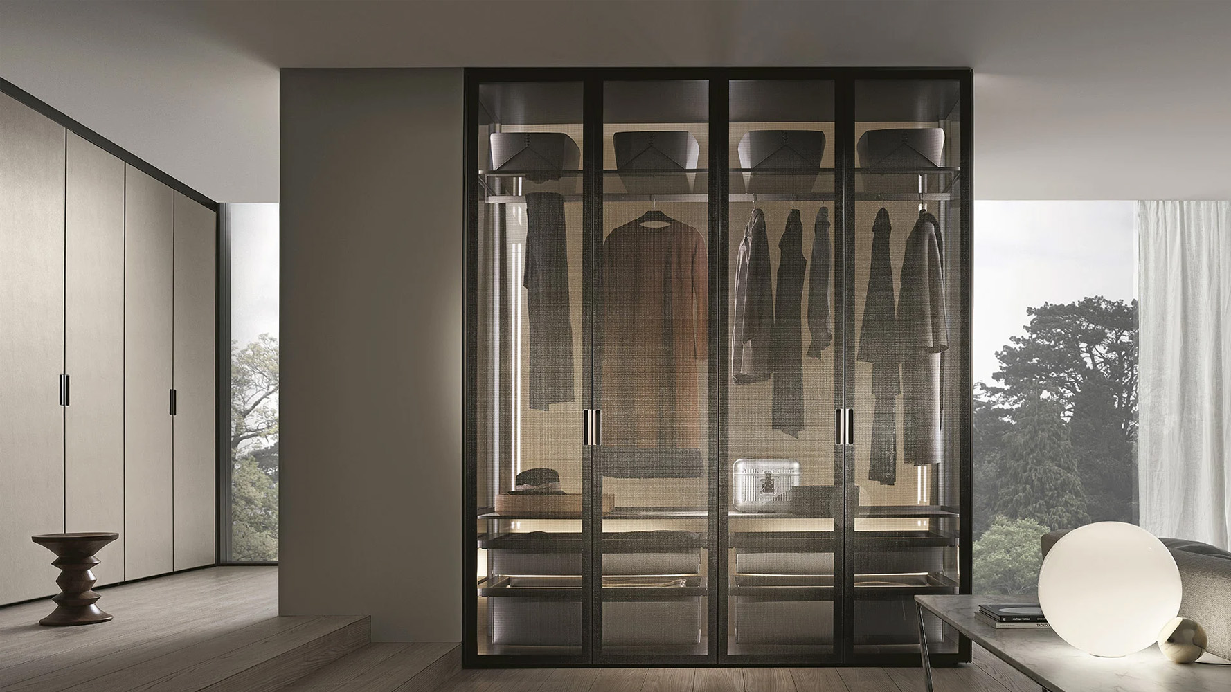 Широкий выбор материалов и отделок — стекло различных типов, Litech, ткань, рафия, экокожа и дерево — позволяет создавать как прозрачные гардеробные-витрины, так и более закрытые шкафные композиции.