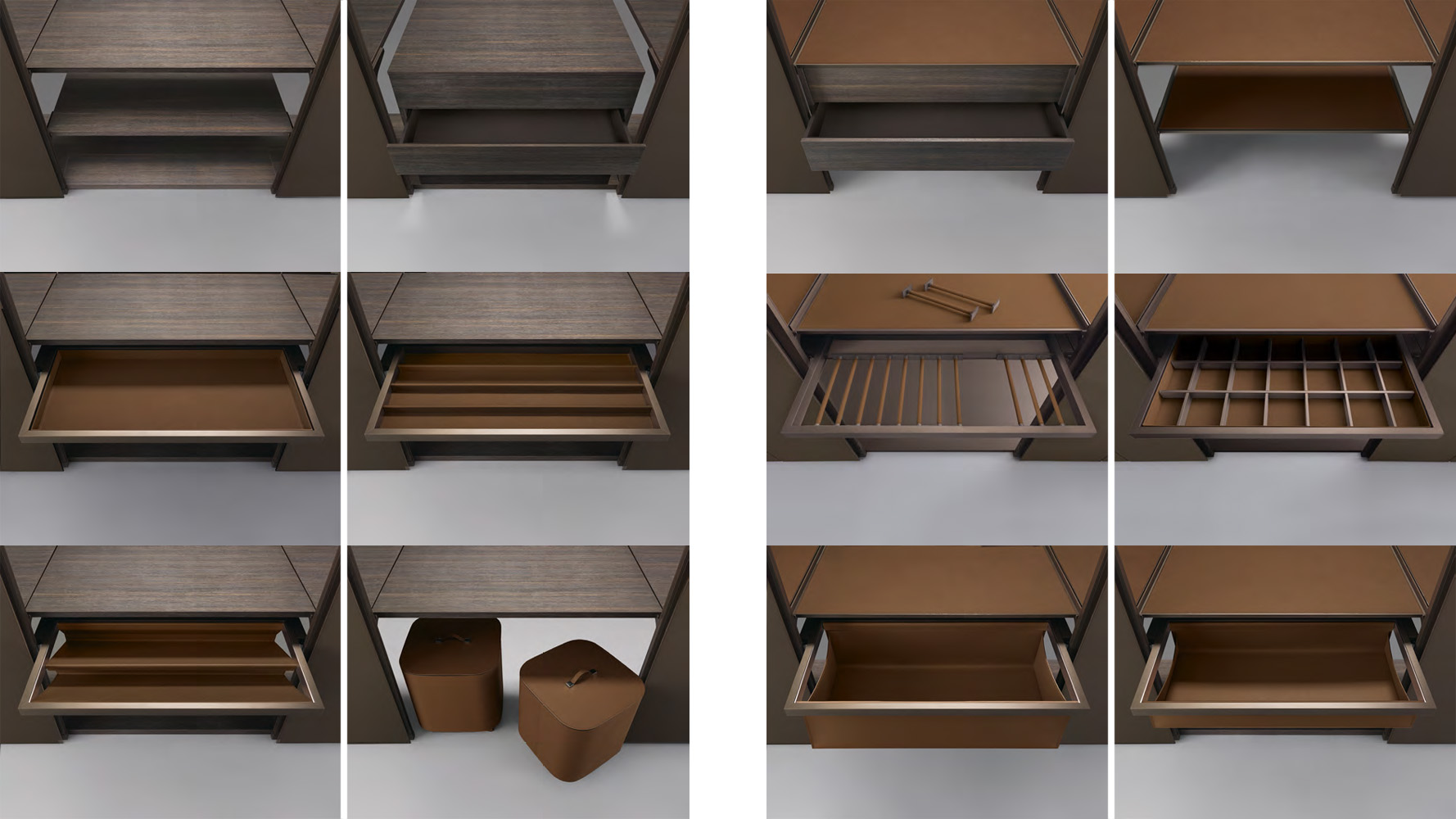 Конструкция основана на алюминиевой структуре, к которой крепятся двери и внутренние элементы хранения — полки, ящики и аксессуары. Все элементы фиксируются без видимых креплений, что обеспечивает чистую архитектурную поверхность и позволяет легко изменять конфигурацию системы.