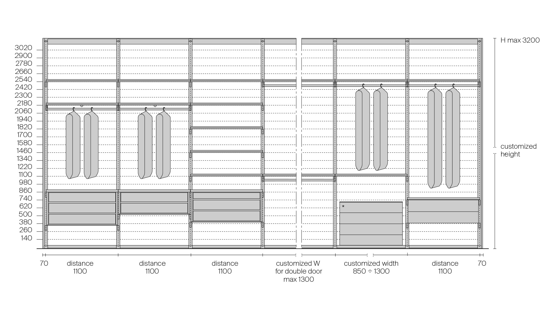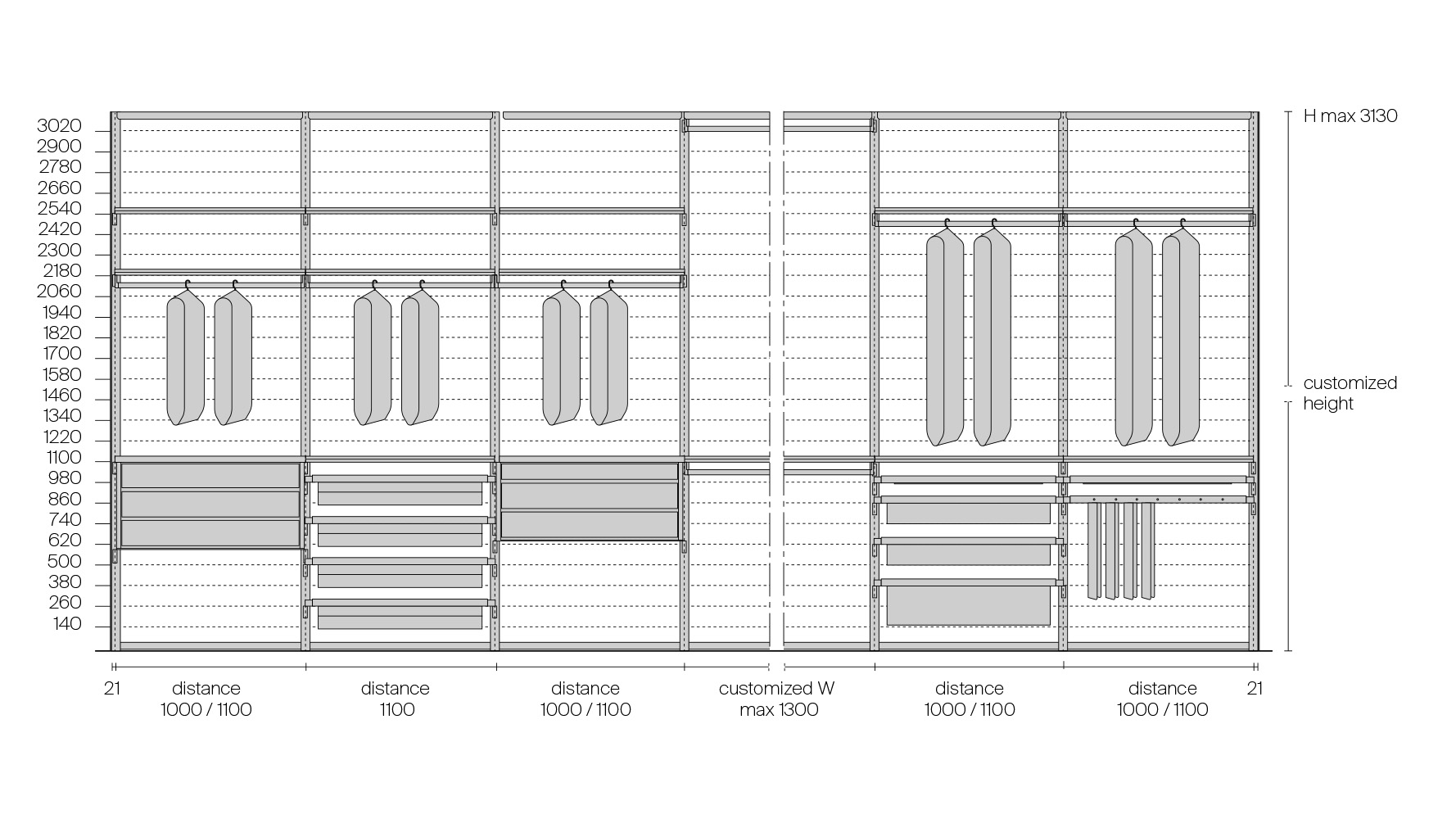 Эта версия системы Cover выполнена как отдельно стоящая конструкция с боковыми и задними панелями, благодаря чему система может формировать линейные или угловые композиции и использоваться как самостоятельный элемент интерьера. Такое решение позволяет организовать гардеробную не только в нише, но и в открытом пространстве помещения.